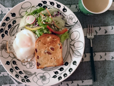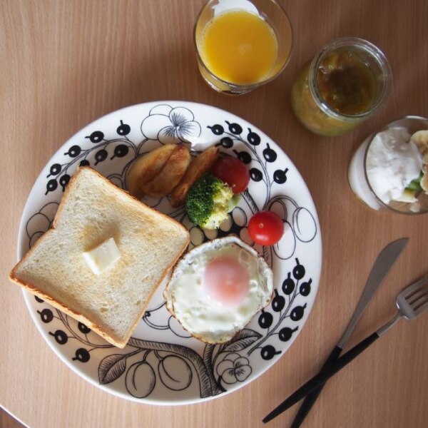 平日はトーストにグリーンスムージーだけの簡単な朝食ですが、休日は卵料理とソーセージ、そしてフルーツヨーグルトにオレンジジュースが加わるのが、最近のわが家の朝食の定番となっています。大胆な柄だけれどモノトーンなので主張しすぎずに料理をひきたて、華やかさだけプラスしてくれるブラパラ26cmは朝、昼、晩のワンプレートととして大活躍です。