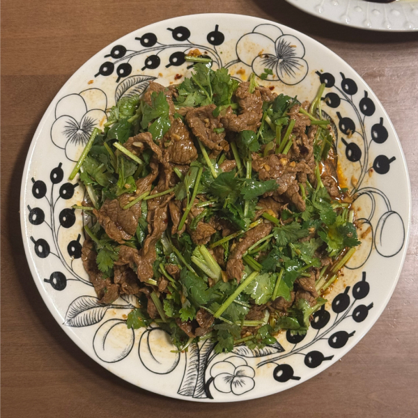 直径26cmの大きめサイズで、ワンプレート料理はもちろん、混ぜ合わせるタイプのサラダにもぴったりのプレートです。今日は中華風の牛肉パクチーサラダをたっぷり。汁気のある料理でも、余白があるから見た目もすっきり。食欲をそそる一皿に仕上がります。食卓に華やぎを添えてくれる一枚です。