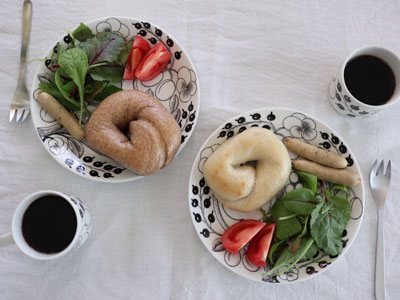 ワンパターンで簡単になりがちな忙しい朝食のときでも、このブラパラのモノトーン柄が華やかにみせてくれます。 この日のメインは会社近くのタヌキアペタイジングさんの大きめベーグルを。ベーグルが大きくておいしいのでおかずが少なくても十分満足!おなかいっぱいです!!