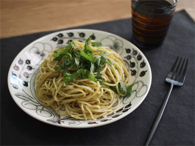 今日のパスタは、大葉で作った「シソベーゼ」を絡めて、青シソパスタ。和風パスタにはブラックパラティッシが似合います。21cmのプレートは、柄のバランスがきれいですね。