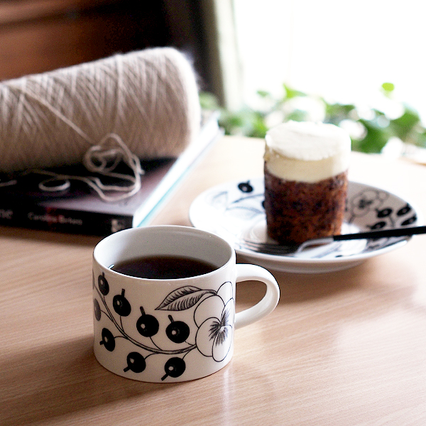 わが家の食器棚には柄物は少なく、料理映えするだろうと思いほぼ無地。けれどブラパラは違いました。この大胆な絵柄は料理を引き立て、華やかに見せてくれるんです。そのうえ全く飽きないから不思議。ティーカップのソーサーは16.5cmのプレートと同じ。ですからカップをマグのように使い、ソーサーはケーキプレートとして使えます。今日はローズベーカリーのキャロットケーキを食べながら、編み物のレシピ本をめくります。今冬何を編もうかしらとあれこれ考えるだけでも幸せ~。