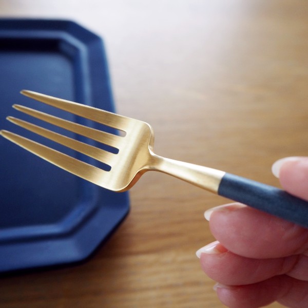 気品のあるゴールドとカジュアルさを残す深い藍色のコンビネーションが独特の存在感を放ちます。ディナーフォークよりもふた回りほど小さめサイズ。デザート用としておすすめですが、女性の方やお子さまのメインフォークとしても使いやすそうです。