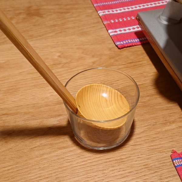 土鍋料理の時には傷つけないよう公長齋小菅のお玉Sを使うのですが、このお玉を置くのにボデガ200がちょうどいいんです。立てておくことで食卓のスペースを有効に使うことが出来るし、持ち手が上向きになるのでどの席からも取りやすく、食事中の「ちょっと取って」がなくなります。ご家族の多い方におすすめしたい使い方です。