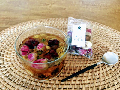 バラや菊花、ナツメ、白きくらげなど体に良いものが8種類入った、見た目もかわいい「食べる八宝茶」。お花以外はそのまま食べることもできるんですよ。お湯を注いで3分、乾燥した花が開いてきたら飲み頃です。シンプルなボデガなら花が開く様子も楽しめます。