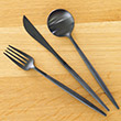 ゴアの新色ブラックブラックは、ゴア特有の樹脂製のハンドルにムーンマットと同じセミマットのブラックを組み合わせたオールブラックのカトラリーです。全体的に渋さのあるシックな印象ながら、程よいカジュアルさを感じさせるのは、ハンドルの質感によるものが大きく、ややグレーがかった色合いがドレスダウンさせています。洋食器だけでなく和食器や木製のテーブルウェアとも合わせやすいテイストで、テーブルコーディネートの幅が広がるシリーズです。
