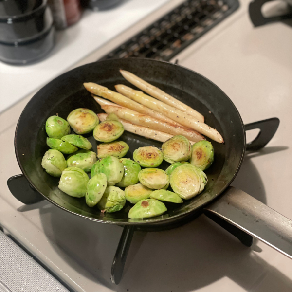 初春は芽キャベツの旬です!芽キャベツを焼いてステーキのお供に食べることがおススメです。小さい食材ですので、いつものフライパンを使ってもいいですけど、なんかもったいない感じがしますね。このような時、プロキッチン別注のちょこっとフライパンは重宝するアイテムです。厚み2.3㎜は高い蓄熱性を持っていて、ヒレステーキを焼く用にもちょうどいいです。私はいつもヒレステーキを焼いて、ステーキを寝かせる間にお供の野菜かマッシュルームを焼きます。最初から最後まで、すべての作業はこの小さいフライパンで済みます。日常生活に欠かせない私の相棒です。