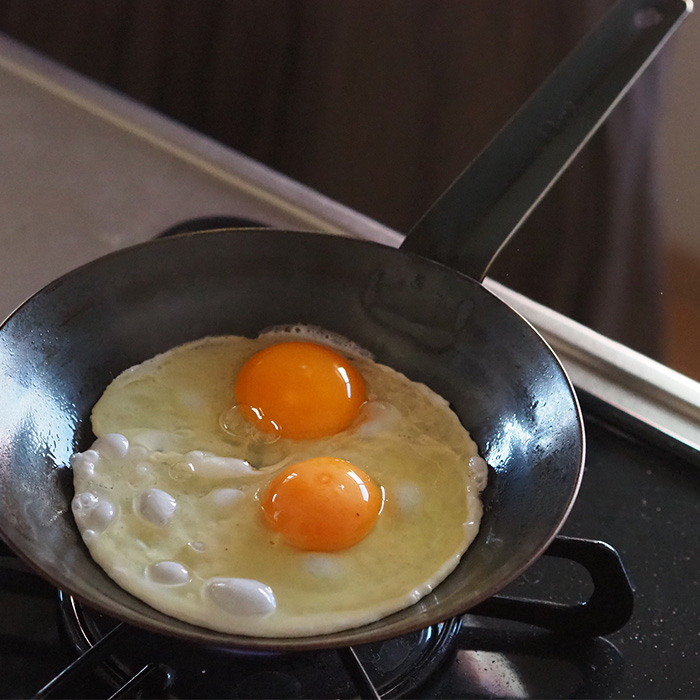 鉄板の厚さは重要! 鉄板が厚いと焦げづらく、冷めにくい!肉料理もジューシーに!この厚さは大きいサイズだと重くなってしまいますが、このサイズなら取り回しも楽々。小さいながらも働き者のフライパンです。