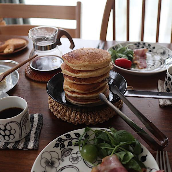 18㎝のフライパンですが、底の平たい部分は12㎝なので、小ぶりのパンケーキがほとんど同じサイズで作れるんです。 お玉ひとすくい分の生地でどんどん焼いて(焼いたら別のお皿に積み重ねてます)、最後に積み上げるとこんな感じにパンケーキタワーの出来上がり. 食卓にこのままどん!と出すと子どもたち(パパも笑)からも歓声があがります♪