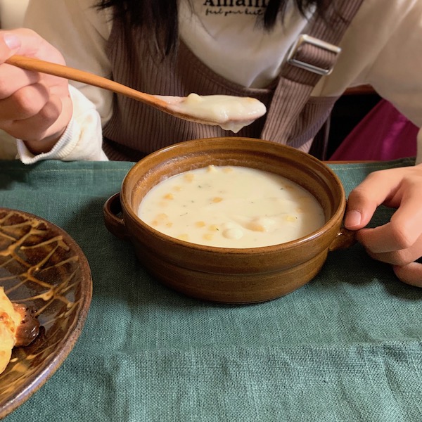 このグラタン皿の全力推しポイントは「角がない丸い形」と「トースターに入るサイズ」です。グラタンって焦げたチーズがこびり付いたり、トロッとしたホワイトソースが四隅に残って洗い物が少々面倒。でも、丸型だとスポンジでゴシゴシするときもやりやすいんです。と言いつつ今日のメニューはジャガイモのポタージュ。耐熱性が素晴らしく、たっぷり盛りつけても美味しい温度のままごちそうさまができます。