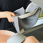 どのようなキッチンとも仲良くできるニュートラルなグレーをベースに、色見本とにらめっこしながらセレクトしたのがダークグレーとライトグレー。同色で統一してもスタイリッシュですが、2枚並べてストックしたときにも違和感のない色味のトーンになっています。立体感のあるジャガード織りは上品な柄を楽しめるだけでなく、しっかりとした耐久性と毛羽落ちを防ぐ効果も。使いはじめから心地よい柔らかさがあり、グラスの底やお皿の高台周りにも気持ちよくフィットしてくれます。