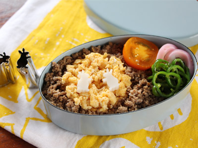 そぼろ弁当をアレンジして十五夜弁当にしました。月はいり卵、うさぎはかまぼこで抜いてあります。抜き型を使うだけで季節感が出たり、レベルアップしたお弁当に変わりますよ。野菜が苦手なお子様には可愛いうさぎで抜いてみたらがんばって食べれるかも!
