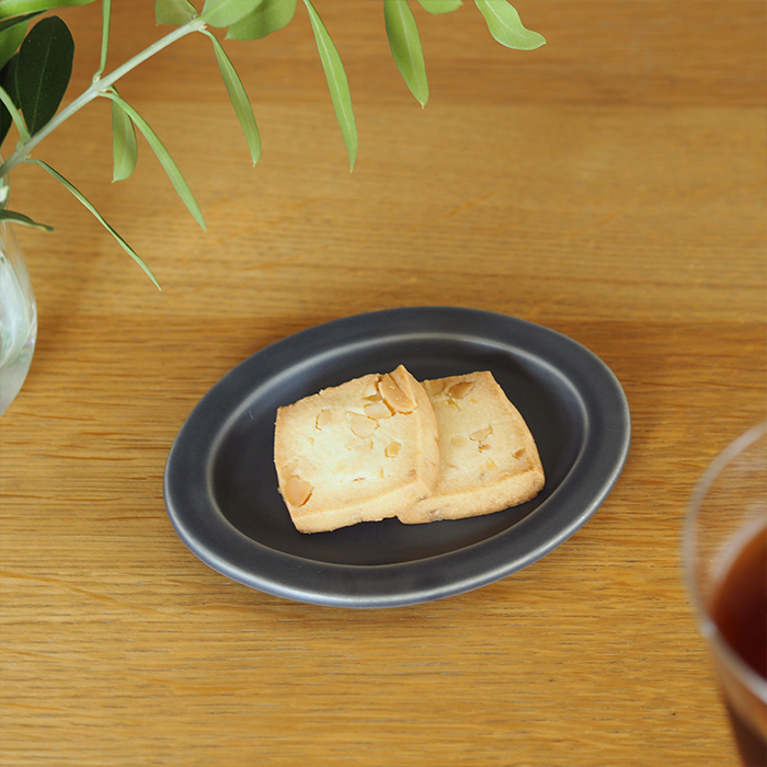 イメージ撮影の時に背景にちょっとお菓子を映り込ませたい。。。という時にこちらのプレートが大変役に立ちます。主張し過ぎずに存在感を出してくれるので、イイ感じにコーディネートがまとまるのです。和でも洋でもすっと馴染んでくれる懐の深さ。練り切りや豆大福などの和菓子ももちろんOK。緑茶やお抹茶と一緒におもてなしの席で使ってもよさそうです。他にもアクセサリーの一時置き場としても素敵。バイヤーが作山窯と一緒に拘って編み出したオリジナルの深いグレー色にも注目です!