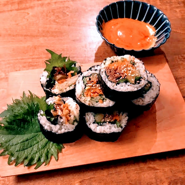 韓国の俳優さんたちが期間限定のお店を出すというバラエティ番組『ソジンの家』、どれもおいしそうで今更ですが、その中のキンパをまねして作ってみました。思い立ったらすぐ作りたい、食べたい!牛肉、人参、もやしたくあんは用意できたのですが、えごまの葉が近所では見当たらず大葉で代用。ちょっと違う味になってしまいましたが・・・。いつもはおやつを食べるのに使うことが多い木のトレイが役に立ちましたよ。