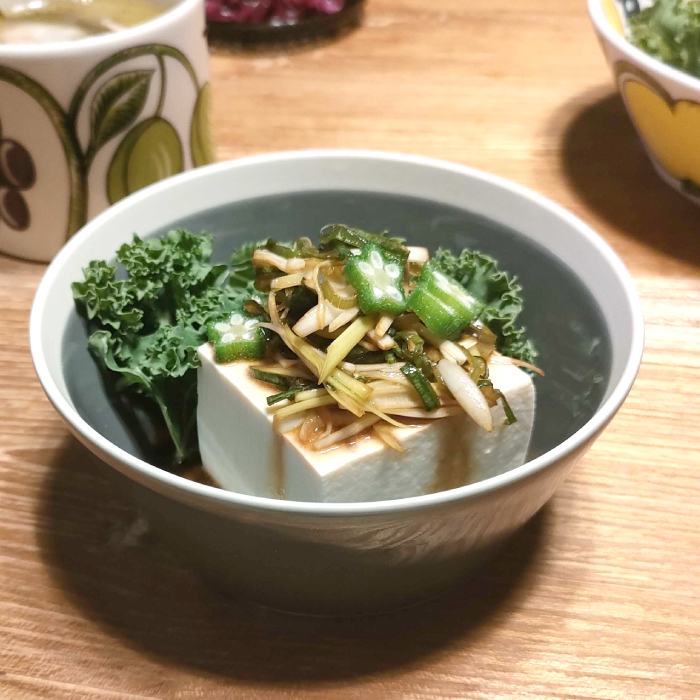 我が家の薬味たっぷり冷ややっこは、1人100g(2個パックで売られている豆腐の半分)です。今までカステヘルミのボウルを使っていましたが、ちょっと小さかったんですよね。このボウルだ!と気が付いた時は心が躍りました。この日の薬味はエシャロットの千切りと青ネギをごま油とにんにく醤油で和えたもの。オクラとケールのサラダもトッピングしたら、健康意識が高そうな仕上がりになりました。