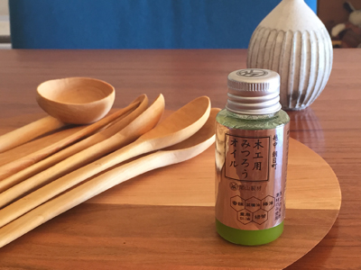富山県の材木屋さん、尾山製材の木工用みつろうオイルは原材料にとことんこだわった人と環境にやさしいエコロジーオイル。有機溶剤・合成樹脂・乳化剤を一切含んでおらず、国産みつろうを始めとする自然成分のみで作られています。大きな特徴は「緑茶成分」を配合していること。植物性油が主原料である塗料は時間と共に酸化臭が発生する事が多く、また固く塗りにくくもなります。そこで、この問題点を克服するために研究を重ね、酸化しにくい緑茶成分を植物性の油に落とし込むことで安心と塗り心地、保存性を追求した「木工用みつろうオイル」を完成させました。木の器やカトラリーに安心して使えるだけでなく、小さなお子さんやペットがいるご家庭でも気兼ねなくご利用いただけます。
