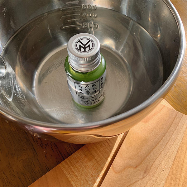 そろそろ乾燥する時期だな〜と気づく頃には、温かい季節は液状のみつろうオイルも固まっていました。早速、洗って乾かしておいた木製プレートに塗ってあげようと、お湯をはった片口でみつろうオイルを温めます。あっという間に液状に戻ったので木製プレートに塗り塗り。私は素手で塗り込むのが好きかも。化粧水を塗り込むような気持ちで、ボーッとしながら道具の手入れをする時間も良い気分転換です。
