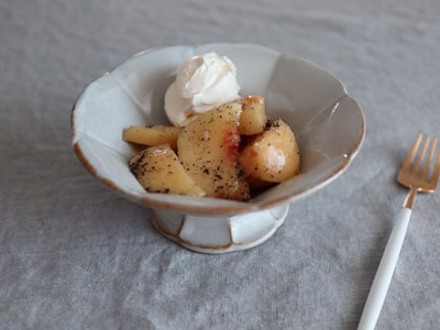 いま巷で話題の「桃のアールグレイマリネ」を早速作りました。これがとっても簡単でおいしいんです!見た目はシンプルなデザートなので、エクロールの器にのせてちょっと特別なデザートになりました。