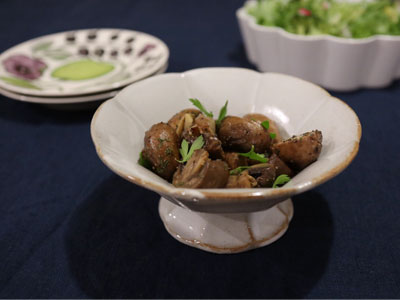 食卓に並べるだけでぱっと華やかにしてくれるこの器、ホームパーティーには必ず登場します。 今回はワインに合わせて、マッシュルームの白ワイン蒸しを盛りつけました。1パックのマッシュルームも、リムがあるのでしっかり盛りつけられました。