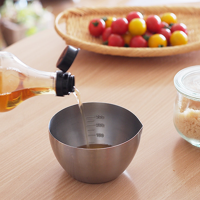 まさに下ごしらえにピッタリな大きさ。卵焼き用に卵を溶きほぐしたり、ちょっとしたものを混ぜ合わせたり、合わせ調味料を作る時など、大きなボウルを出すほどではない作業にもってこいのちょこっとボウルです。親戚からミニトマトをたくさんいただいたので、マリネ液を作るためにこちらのボウルを使います。内側にあるメモリが非常に便利。米酢100mlを完璧に計ることができました。液だれするというコメントがありましたが、注ぎ終わりに少し垂れるぐらいで私は気になりませんでした。