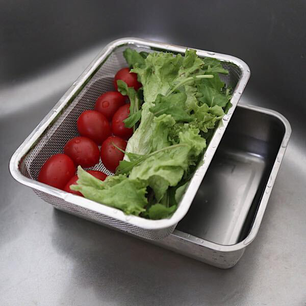 システムバットに角ザルをセットしてじゃぶじゃぶ野菜を洗ったら、そのままバットの上に置いておけば水が切れるという便利な使い方ができる優秀グッズ。丸いボウルよりも平たいので野菜が重なる部分が少なく早く水切れします。バットとザルは別売りですが、ぜひセットで使っていただくことをおすすめします!