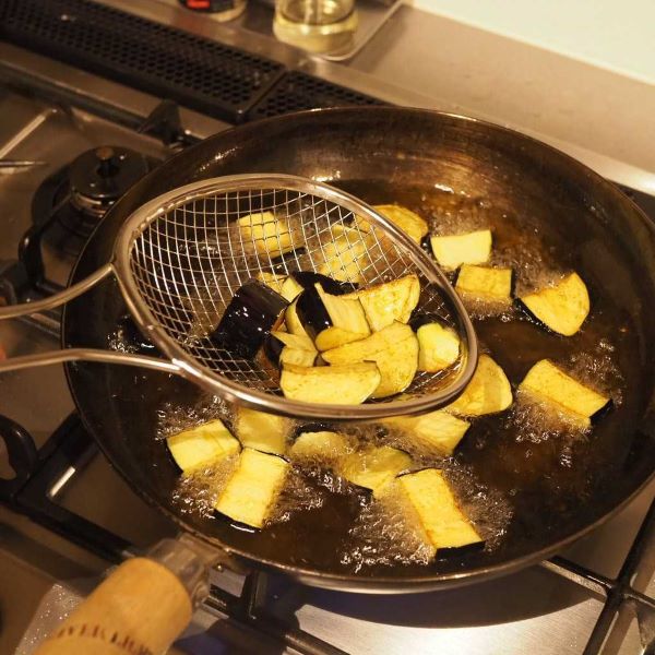 揚げ物というと尻込みしちゃう人も多い料理なのかもしれませんが、鉄のフライパンでも出来ちゃうので気軽にトライしたいですね。野菜を素揚げして、お好みのタレ(面倒ならめんつゆでも)に漬け込んで揚げびたしにすればおいしいですよ~!細かく切った野菜を一気に引き上げられるこの油きりザルがとっても便利。すくいやすい工夫がされたデザインで網もがっしりしているし、油切れもいいので鼻歌交じりで揚げましょ~(笑)