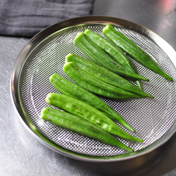 私が家事問屋の盆ザルに向いていると思う使い方は3つ。「茹で野菜のおかあげ」「魚の下処理」「揚げ物のお皿」です。今回はオクラをおかあげしているところをご紹介。ボール型のザルにあげるよりも蒸気が上がりやすく、サッと粗熱が取れて色良く仕上がるように感じます。ステンレス製だと食洗機に入れられますし、取扱のしやすさも相まって便利に使っています。