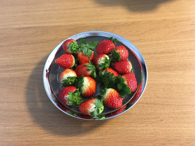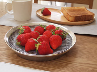 ごはんのあとに必ずちょっとしたフルーツが必須の我が家。洗って水をきれる家事問屋の盆ざるとまる型トレーが大活躍しています。小泉誠さんデザインなのだそうで、とっても洗練されていてそのままテーブルにだせます。フルーツだけでなく敷紙をしいて揚げ物の器としても使えます。食材を広げて効率良く水切りでき、下ごしらえの道具としても優秀です。