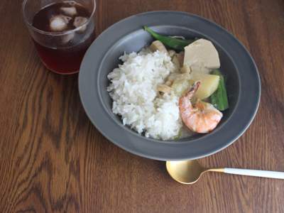 タイカレーにしました。おおざっぱに切ったので野菜や鶏肉が大きくなってしまいゴロゴロしたカレーになりましたが、深さがちょうど良いので緩いカレーと沢山の具も受け止めてくれる頼もしいボウルです。
