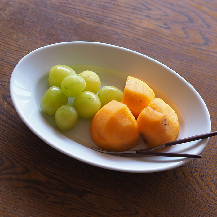 白い色のお皿は同じように見えてもそれぞれ違った白で別々の趣がありますよね。ティーマの白も大好きですが、少し気分を変えたいときはこのピリヴィッツのお皿を使います。真っ白の奥に青味があるような白で清潔感があります。パリのカフェで使われるお皿なのでタフなところもうれしい。オーバルの形もサイズも絶妙で、一人分の朝食にベストサイズ。今回は秋の果物を盛り付けて、うん。いい感じです。