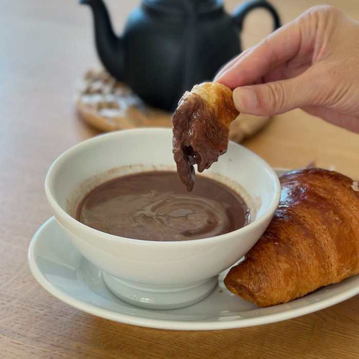 パリのカフェで飲む「ショコラ・ショ」を味わってみたいとレシピ検索してみました。すると仰天、一杯にダークチョコレート50g!生クリーム50ml!砂糖も加わります。これは飲みきれなさそうだと諦め、チョコレート半量、生クリーム抜き、ココアパウダーたっぷりでアレンジすることに。それでも十分濃厚なショコラ・ショ風の飲み物が出来上がりましたよ。ピリヴィッツのカフェオレボウルに注ぎ、クロワッサンを添えて召し上がれ。とびきり寒い日にはカラダの奥底から満たされ温まります。