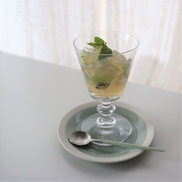 先日社内でワインの会(ぜひ私、蟹谷の「暮らしのひとコマ」をご覧ください!)があり、私はデザートを作ってきました。ミントのゼリーにキウイを合わせたデザートは、新商品の「木村硝子店 フランス6oz ワイン」を使ってみました。そこに合わせたのはイイホシさんのピスタチオのプレートとセラドングリーンのティースプーン(現在は販売終了)。爽やかな組み合わせで、見た目も涼し気で食後の口直しにもぴったり。ワイングラスは先日販売開始となりました。ぜひチェックしてみてくださいね!