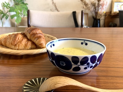今更ながらですが、白山陶器の使いやすさに衝撃を受けています。このブルームは「使いやすくてかわいいデザイン、そして気兼ねなく扱えるお値段」というわたしのモノ選びの基準を見事にクリア!コンパクトに重ねて収納もできるし、器のラインに自然と手がフィットして違和感を感じません。今日はかぼちゃの冷製スープとクロワッサンでランチです。