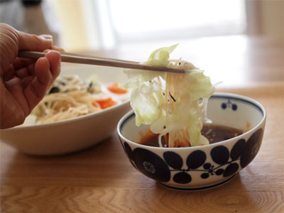 まあるい植物柄がかわいいBLOOMの器。和にも洋にもよく合うので、出番が多い器です。今日はつけ麺のつけダレに。冬は鍋のとんすいとしてもちょうどよいサイズですよ。軽いので取り扱いもしやすく、つい手にとってしまいます。