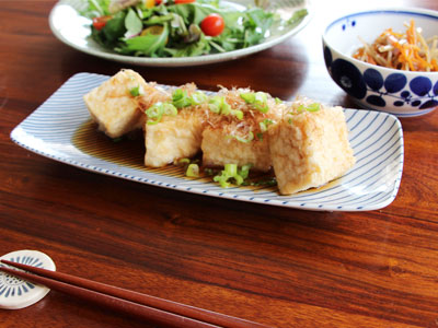 お酒のつまみに揚げだし豆腐。お酒を飲む時はちょっとずつ盛りつけられるつまみ皿として使います。 青色のストライプはどんな食材にもあわせやすく、他にもキムチ、漬物などにもちょうどいいサイズです。
