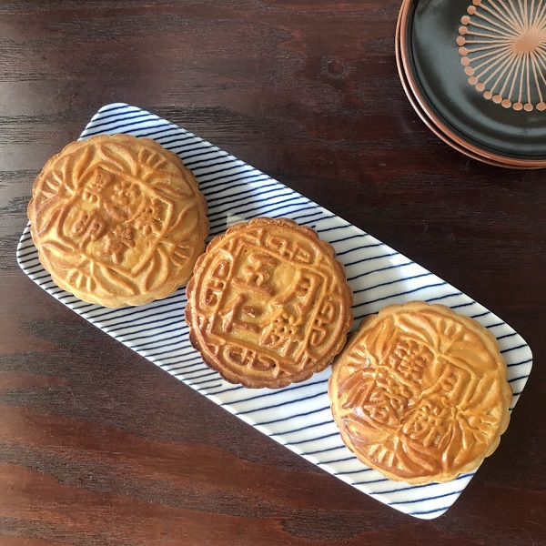 中秋の名月の日に月見団子のかわりに買ってきた月餅、細工があまりに可愛いので並べて食卓へ。1つ8センチぐらいと大きめでしたが長焼皿にピッタリ収まりました。3種類それぞれ食べたいので、食べるときには小分けにしたのですが、包丁を入れるのが惜しいくらい、お店によって模様も違うのでいろいろ食べてみたくなりました。