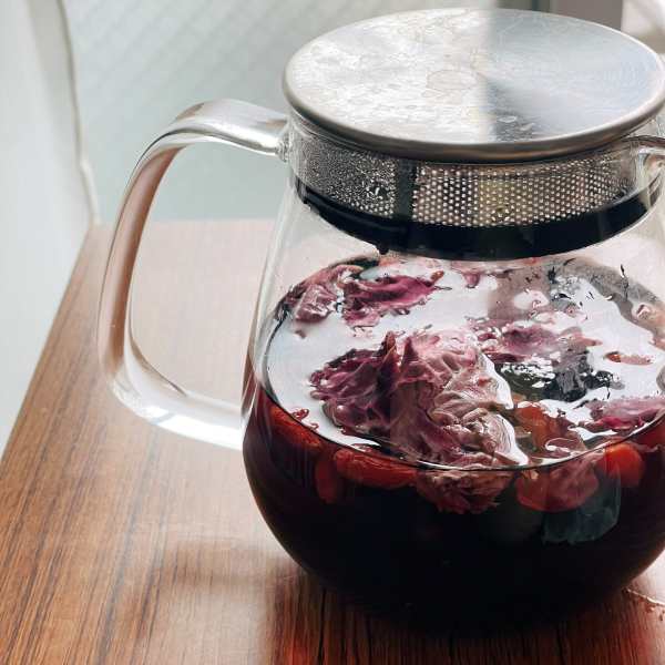 写真の養生茶には桑の実、クコの実と干しバラの花が入ってます。特に桑の実は抗酸化作用を持つビタミンEやポリフェノールを多く含みますので、週三回ぐらい飲んでいます。このようなフルーツの香りを楽しみたいお茶は、私と同じようにステンレスの茶こしを使いたくない方が多いと思います。そのような時、このティーポットがちょうどいいです!栄養成分がちゃんと取れるし、たっぷり飲める容量も我が家に最適です。フルーツティーと養生茶が好きな方にオススメ。