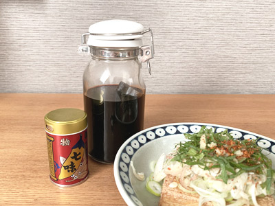 昆布・かつお節・鷹の爪・ニンニクを入れてお醤油を入れただけの簡単だし醤油なのですが、割といろんな料理に使えてオススメです。私はこのだし醤油をワンプッシュ便利びんにいれておいて、かけたい分だけちょろっとかけています。注ぎ口や蓋などのパーツはすべて取り外して洗えるところが気に入っています。