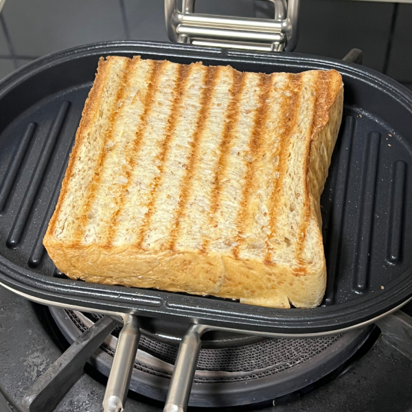 少し厚めの食パンを半分に折るだけの簡単ホットサンドを作っています。具材を挟んで折ってそのまま焼くだけ。コンパクトに焼きあがるので、包丁で切る手間がなくて楽です。余白部分ではウインナーも一緒に焼けて、一度に朝食が完成!いつもトースターで焼いたパンを朝食にしていましたが、子どもから「全然違うからパニーニパンで焼いたパンがいい!」とリクエストされます♪