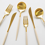 テーブルコーディネートによって幾重にも表情を変える、甘さとモダンさを兼ね備えたアイボリー×マットゴールドのカトラリー。煌びやかなマットゴールドの輝きをほど良く和らげているベージュ色は、テーブルはもちろん肌なじみが良く手元を美しく見せてくれそう。合わせるアイテムがどのようなテイストでも、全体を温かな雰囲気に包んでくれるカトラリーです。