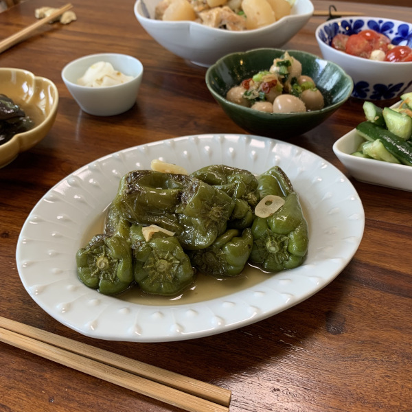 サイズ感が絶妙で、他のスタッフもお伝えしているように、夕食のメインにも、朝食のプレートにも、おやつにも、つい手に取ってしまういっちんのオーバル皿。大きすぎないので食卓にもおさまりがよく、深さもあるから煮汁も一緒に盛り付けたい煮魚なんかにもすごくいいんです。今日はサンマの醤油煮。圧力鍋で煮て骨までいただきます!