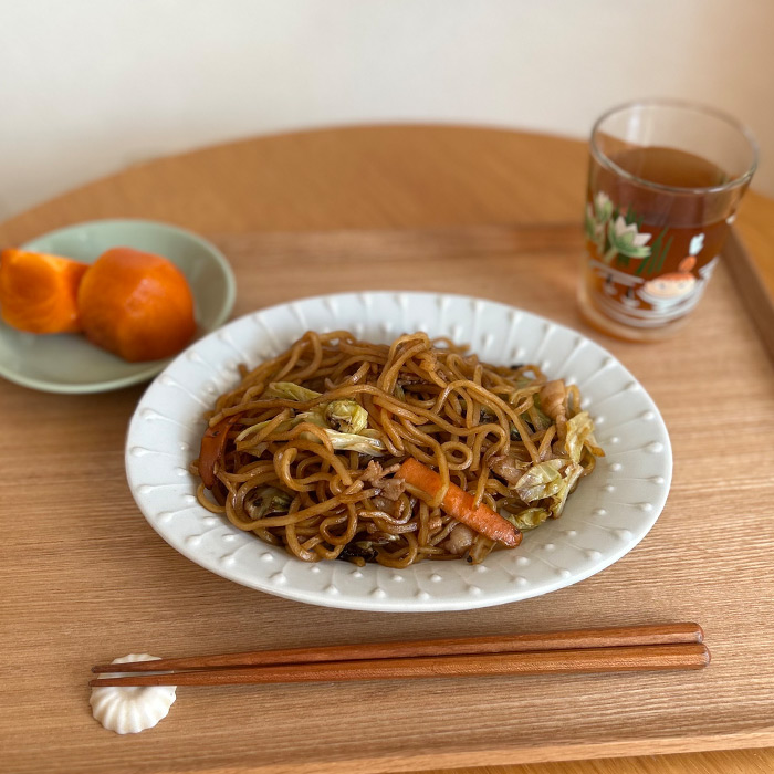 休日のお昼ごはんは、娘の大好物の焼きそば率高し。今日も私の大好きな荒川製麺(麺にコシがある)の富士宮焼きそばの麺を使って、焼きそばを作りました。いつも同じ器(ティーマボウル21cm)を取りがちですが、今日は違う器にしてみようとこちらをチョイス。割と野菜も多めにして作ったのですが、ひと玉分しっかりと盛り付けられました。いっちんの模様の額縁効果で残り野菜で作った焼きそばもそれなりに見える?かな?