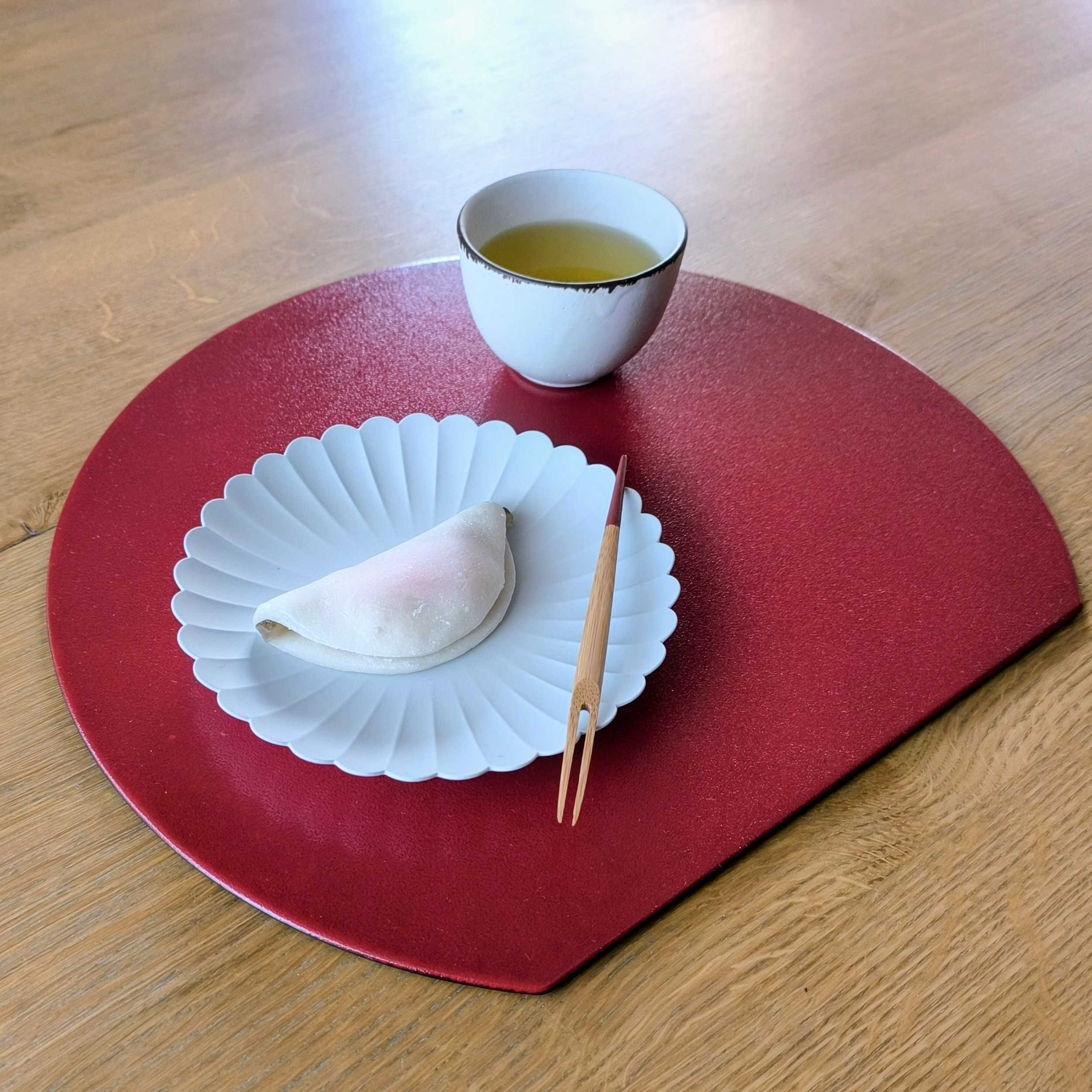 半月盆にのせるだけで、いつも使っているパレスプレートがぐっと引き締まった表情に。お正月ならではの穏やかな時間を感じながら、新しい年を迎えた心持ちに自然と背筋が伸びます。新年を祝う和菓子「花びら餅」をおやつに。やわらかく伸びる求肥と、ごぼうのシャキシャキとした食感の組み合わせが印象的で、とても美味しくいただきました。