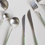 日本の食卓に馴染みのあるセラドングリーン(青磁色)×シルバーの組み合わせは優しげで、思わず手に取りたくなる可愛らしさです。気取りのない普段の食事からお正月などのハレの日のスタイリングまで、どのようなシーンも軽やかにまとめてくれそう。日本の伝統色である山葵色を連想させることからも、和の食卓との相性は素晴らしいの一言です。