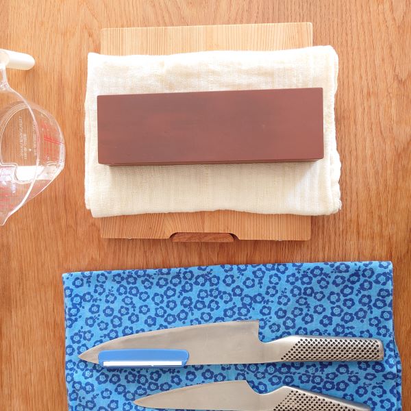 砥石を快適に使うためのポイントは、包丁の滑りをよくするため、使う前に砥石から気泡が出なくなるまで水に浸しておくことと、台付きの砥石ではない場合は、作業中に砥石が動かないようタオルや手ぬぐいを砥石の下に敷いて使うこと。使い終わったら水気を乾かして、なるべく包丁の近くに保管しておくと忘れずメンテナンスを行うことができます。
