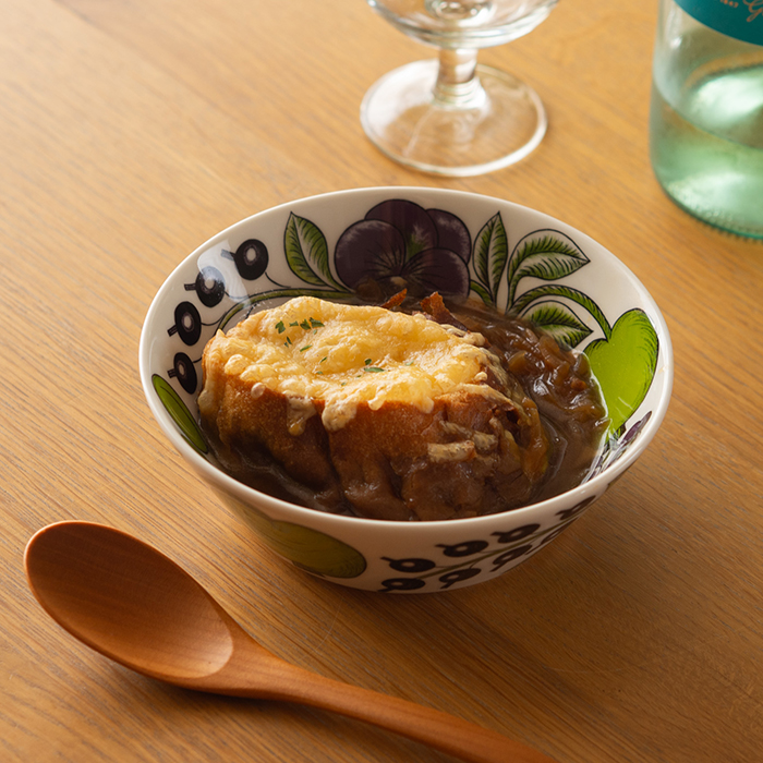 2021年に追加されたパラティッシの中でも新しいアイテムの13cmボウル。ティーマの15cmボウルより一回り小さいサイズ感でフルーツ入りヨーグルトやサラダにぴったりで、つい手に取ってしまう使い勝手の良さです。一人ランチのときには、ご飯とおかずを盛って簡単丼にしたり、写真のようにオニオングラタンスープを入れても大活躍。見ているだけで気分が上がる「パラティッシマジック」が健在のボウルです。