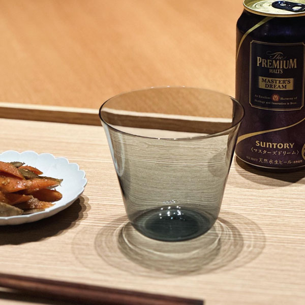 木村硝子店からベッロシリーズのグラスをご紹介します。このシリーズは”日本人の味の楽しみ方”を追求して製作されたグラスで、ワイン・日本酒・お茶などの美味しさを最大限に引き出し、かつ日本人の暮らしに寄り添う形に仕上げたものです。SDGs商品としても注目されていてるベッロLs(エルエス)。ベッロシリーズの色ガラスバージョンで車の窓ガラスを利用したスモーク色の再生ガラスを約70%を使用して作られています。窓ガラスのスモーキーな色合いがそのまま薄はりのグラスに溶け込むとクリアとはまた違った洗練さが生まれ大人っぽい印象に。細かい気泡や、ロットによる色ムラ、個体差など再生ガラスならではの生地の表情や質感をお楽しみいただければと思います。
