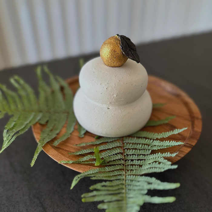 ざらついた質感の白いマット釉薬に包まれた鏡餅に、一点づつ丁寧に作られた黄金色をした橙のミニチュア。鏡餅のお飾りは色々な商品がありますが、インテリアを格上げするセンスの良さを感じられるものは多くありません。そんな中で原田さんの鏡餅を一言で表すなら「お洒落」。色調や質感から大人っぽさが漂い、モダンな佇まい。落ち着いたインテリアや、伝統的なしつらえにもしっくりと馴染みます。私が特にお気に入りの「橙」のミニチュアはお正月が終わったら、それだけで飾ろうと思います。