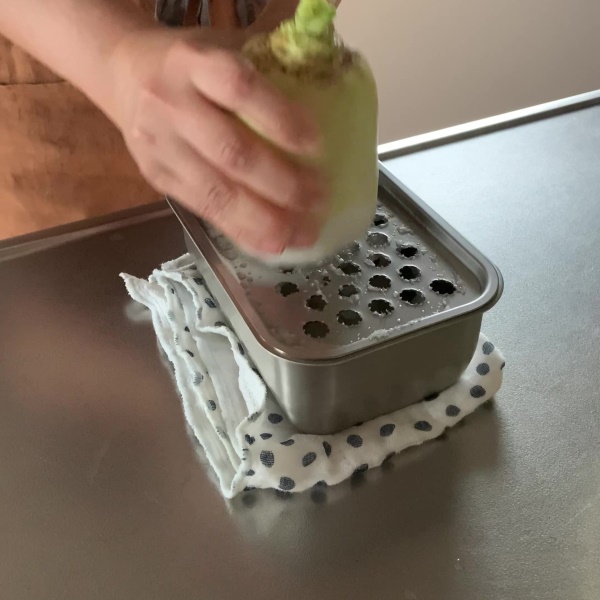 大根やにんじんなどを軽い力でおろすことができるだけでなく、プチストレスになる繊維の引っ掛かりも少なくなるよう刃の配置を工夫しています。さらにおろし目の尖りを抑えているため、使い終わった後は流水でさっと洗い流すだけでOK。おろした大根おろしをすぐに使わない場合は、システムバット付属の樹脂フタをして冷蔵庫で保存することもできます。使う際のポイントはシステムバットの下に布巾などを敷くこと。作業中にバットが滑らず安定感が増します。