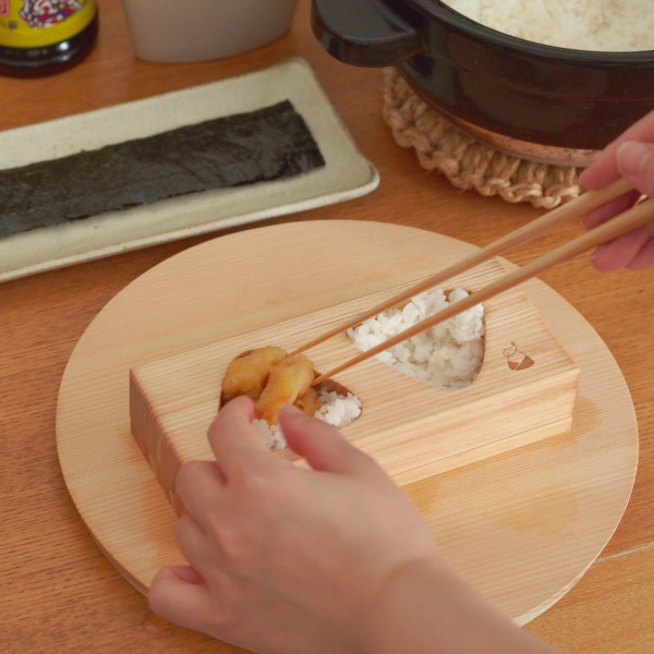 ひのきの型にごはんを詰めると程よく水分を吸い上げてくれるから、ごはんの美味しさを引き上げほろっと口どけのよい食感に。さらに、ひのきの香りがほんのりおにぎりに移り、美味しさ倍増です。そして、台座はおにぎりを食べるときのトレイとしても、ミニまな板としてもお使いいただけます。