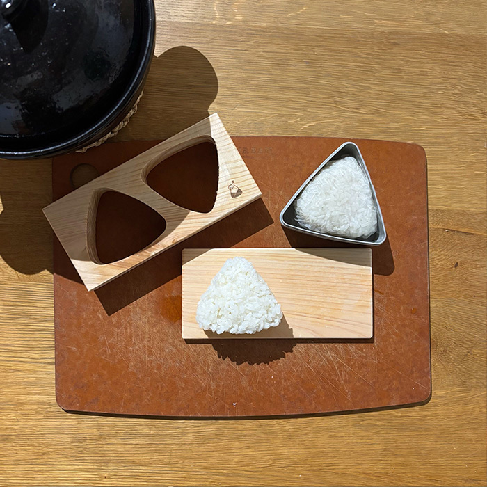 ひのきの型にごはんを詰めると程よく水分を吸い上げてくれるから、ごはんの美味しさを引き上げほろっと口どけのよい食感に。さらに、ひのきの香りがほんのりおにぎりに移り、美味しさ倍増です。そして、台座はおにぎりを食べるときのトレイとしても、ミニまな板としてもお使いいただけます。